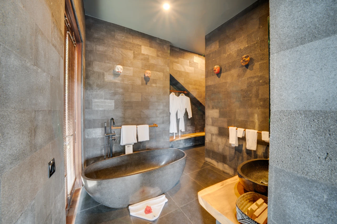 This 60 m² Dharma Villa features one double bed and offers comprehensive views of the jungle, garden, pool, and mountains from its private balcony and terrace, complete with a private bathroom with a bathtub, AC, minibar, free Wi-Fi, and a complimentary extra bed and breakfast for one child (0-12 years old).
